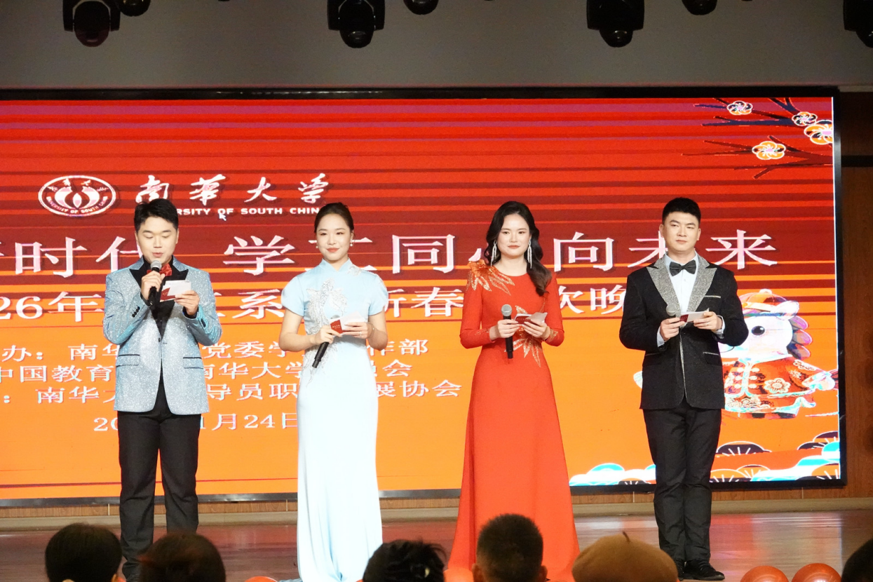 晚会在2025年新入职辅导员带来的唱跳节目《导员ING》中活力开篇,青春洋溢的舞姿、饱含热忱的歌声,生动展现了新入职辅导员的朝气与风采。随后,四位主持人身着盛装登台,以铿锵有力又温情洋溢的致辞,向在场全体学工人致以问候,瞬间点燃全场氛围。紧接着,学校党委委员、副校长王利华登台致辞,他代表学校向辛勤耕耘在育人一线的全体学工同仁致以最诚挚的新春祝福,回顾了过去一年学工系统取得的丰硕成果,勉励全体学工人在马年新征程上,继续坚守立德树人初心,秉持育人使命,以骏马奔腾之姿砥砺前行,续写南华学工事业发展新篇章。